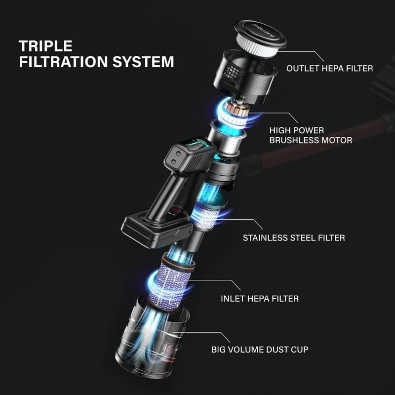 Dilengkapi dengan motor tanpa berus berkuasa tinggi 350W, vacuum cleaner ini mampu memberikan kuasa sedutan sehingga 33,000Pa yang menghilangkan habuk halus, kotoran degil, dan serpihan kecil dengan mudah dari sebarang permukaan lantai.