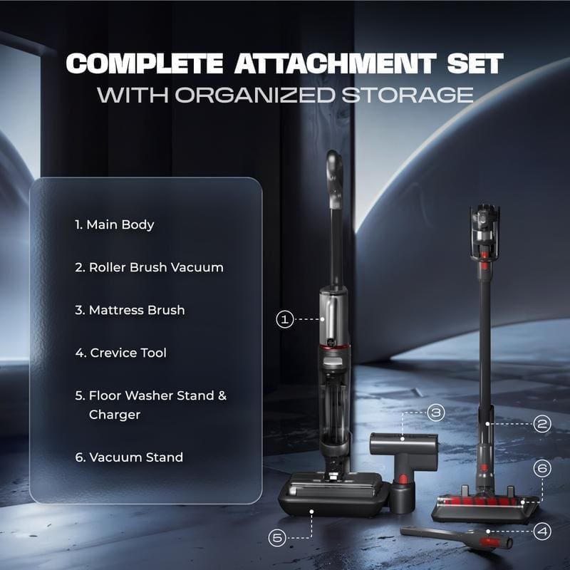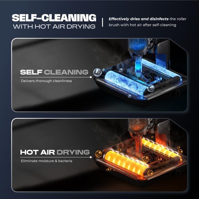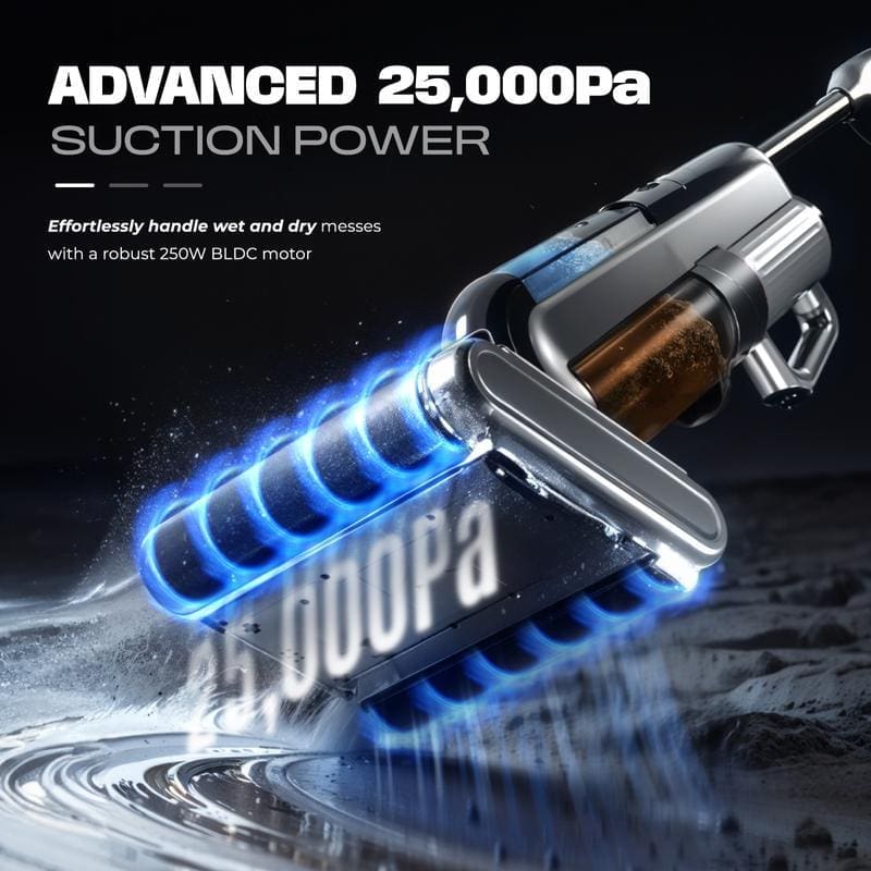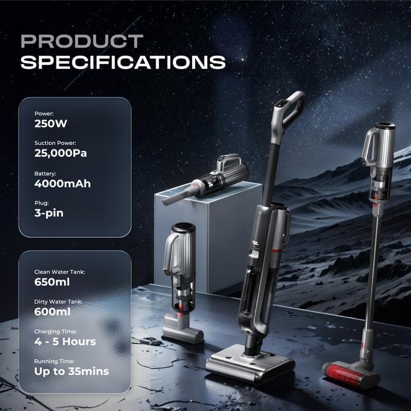 Dilengkapi dengan motor berkuasa tinggi 250W yang menghasilkan sedutan 25,000Pa, mesin ini mudah mengangkat debu halus, rambut, serpihan makanan, malah kotoran degil yang terlekat di celah-celah lantai. Sesuai untuk semua jenis lantai – tiles, kayu, vinyl, dan laminate.